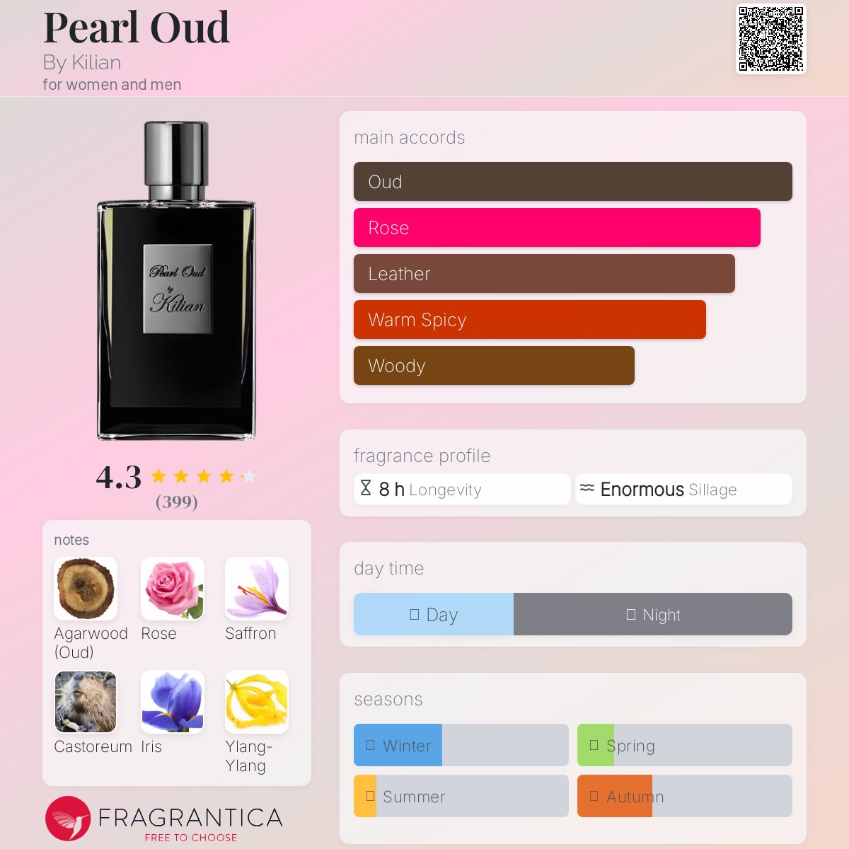 بای کیلیان پرل عود یه عطریه که ابتدا با زعفران و فلفل یه ورودی تند و براق داره، بعد گلها میان و کمی از تندی نرم میشه و فضا رو ملایمتر میکنن، و در انتها عود و کastoreum همهچیو به سمت یه حس شرقی، چوبی و گرم هدایت میکنن. اگه بخوام خودمونی بگم: حسِ یه شب لوکس تو یه هتل قدیمی با فرشهای شرقی، چراغ ملایم و شالِ مخملیه — دقیقا همونه.
