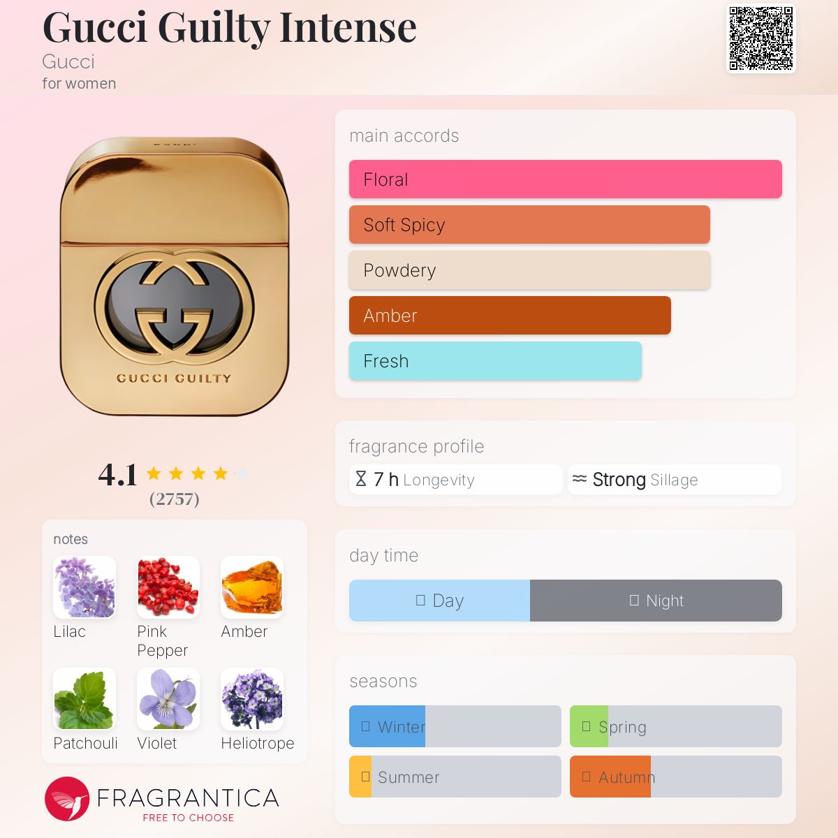 Gucci (گوچی) Guilty Intense عطری شرقی-گلی برای خانمهاست. این عطر در ۲۰۱۱ معرفی شد و توسط اورلیَن گیچارد طراحی شده. نتهای بالایی شامل فلفل صورتی و نارنگی ماندارین، نتهای میانی لیلاک، بنفشه و هلیوتروپ و نتهای پایه عنبر و پچولی هستند — بویی گرم، جذاب و کمی شیرین که برای شبها یا موقعیتهای خاص خیلی خوبه.